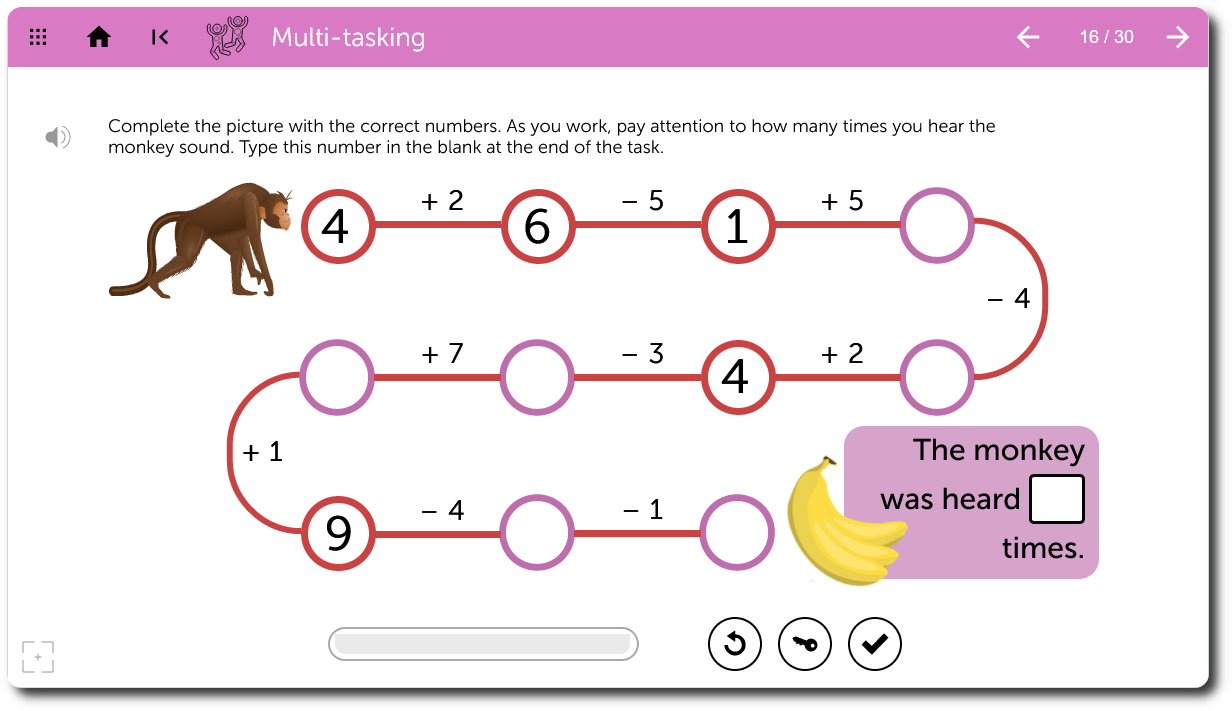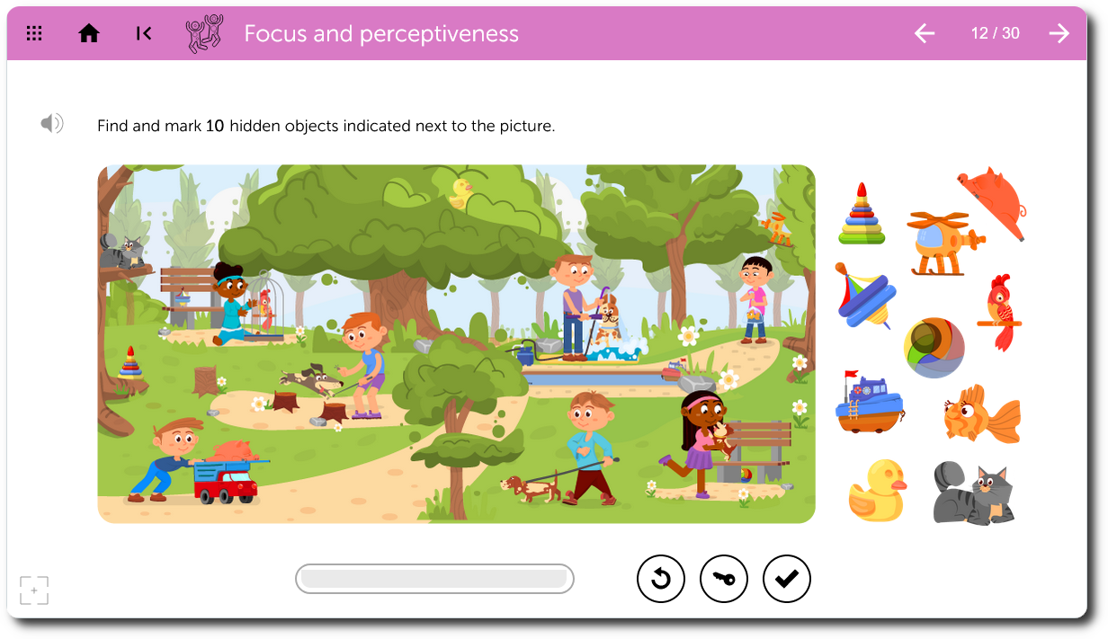 - nearly 700 interactive activities plus worksheets to target various skills underlying ADHD. Additionally, there are extra interactive screens containing exercise suggestions targeting the areas and skills most commonly disrupted in children diagnosed with ADHD (e.g. impulsivity control training, reaction delay, flexibility, cognitive flexibility, planning, verbal fluency, working memory, moral development, and others).