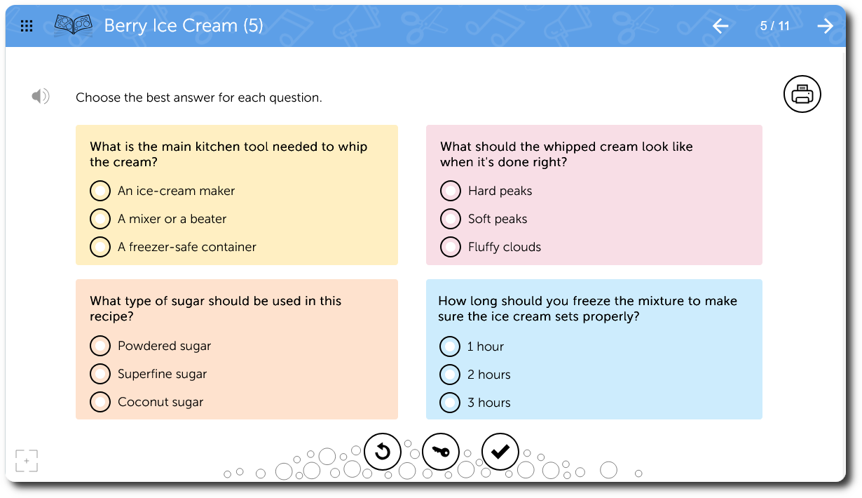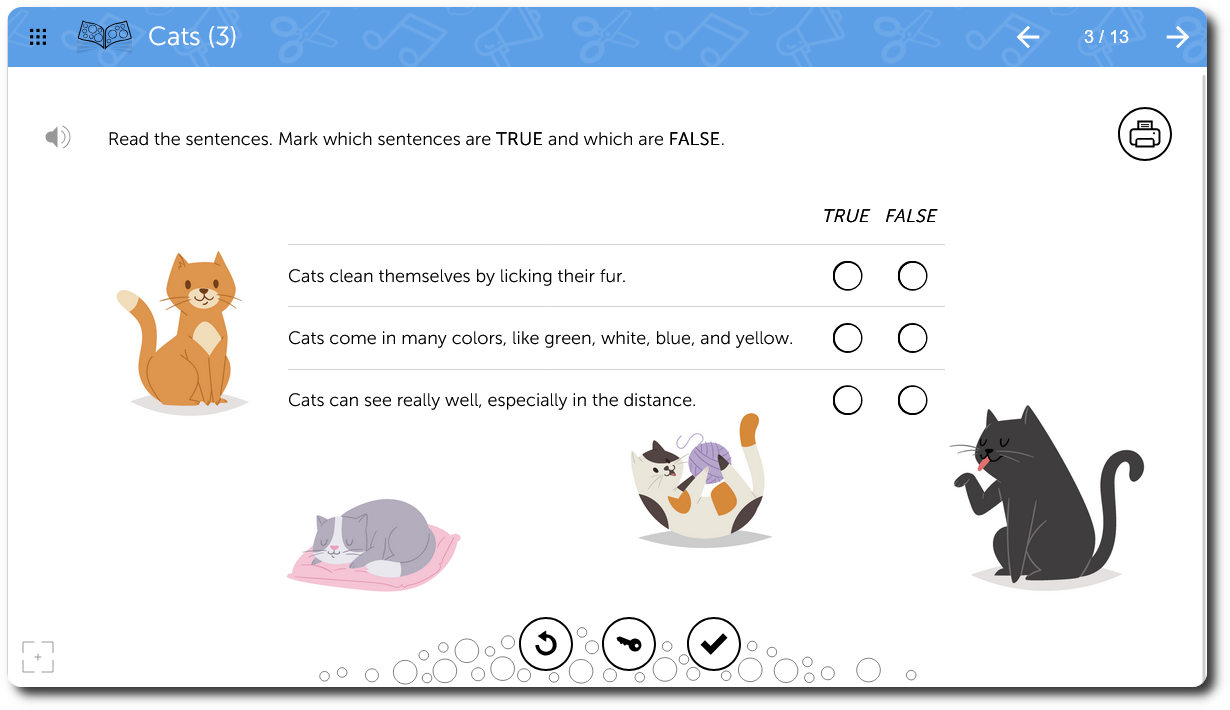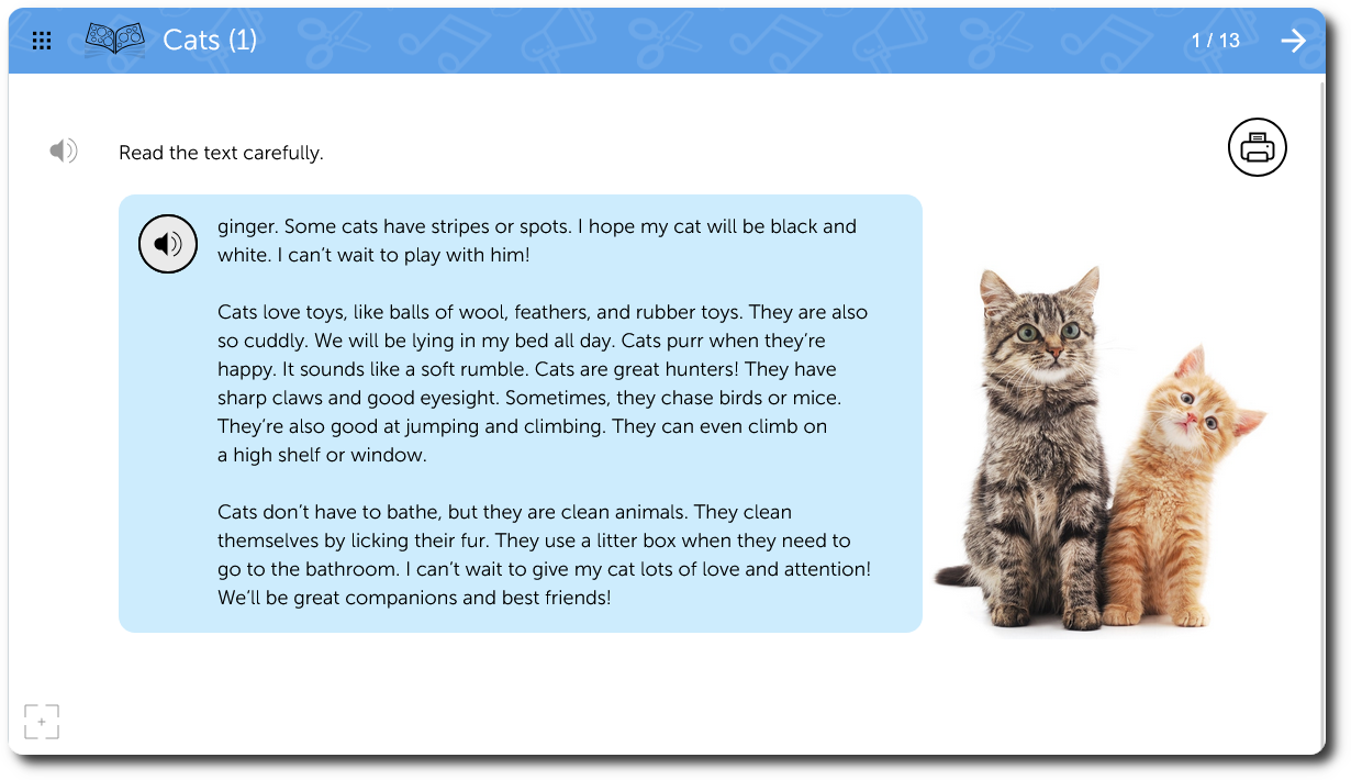 Our digital and printable exercises are designed to enhance reading comprehension skills for students ages 7 and up, whether they are native English speakers or learning English as a second language. The texts are available at three levels of difficulty: grades 1-3, grades 4-6, and grades 7-8.