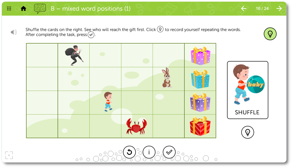 Syllables and Words: Exercises move to combining sounds with vowels to form syllables and integrating them into words. Activities are categorized into initial, medial, final, and mixed word positions to target every use case.